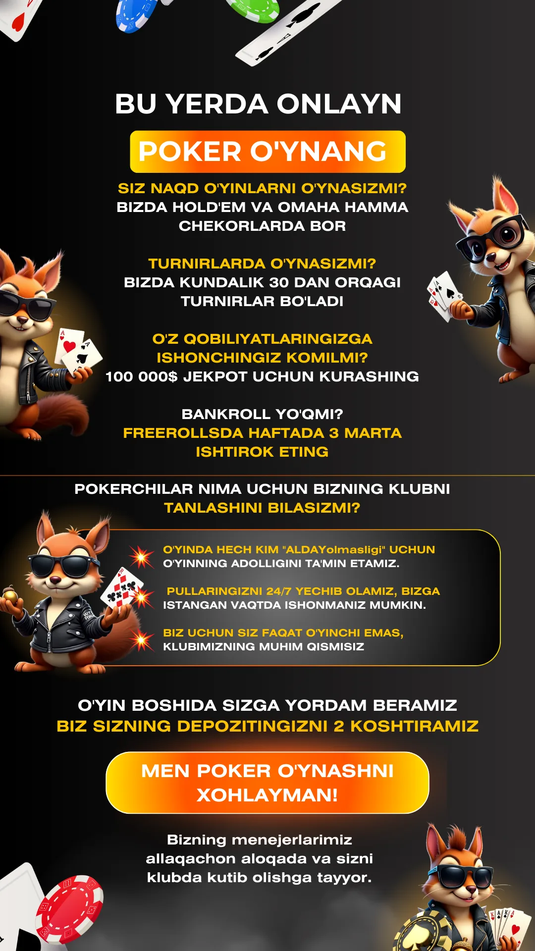 Siz bizning operatorimiz orqali o'zingiz uchun qulay bo'lgan har qanday shaklda depozit qo'yishingiz mumkin. Bank o'tkazmalari va kripto valyutasi qabul qilinadi. Chiplar bir necha daqiqada paydo bo'ladi.